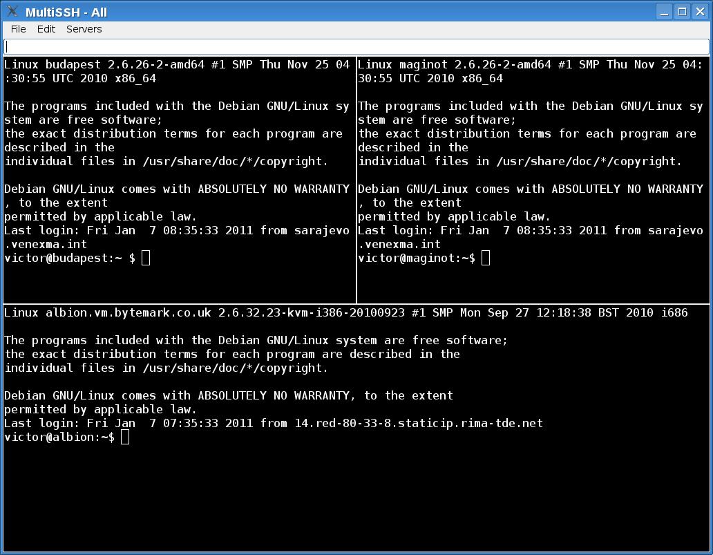 | actual | 10:31 7 ene 2011 | 1032 × 803 (150 KB) | Victor (discusión | contribuciones) | MultiSSH accediendo a tres servidores. |